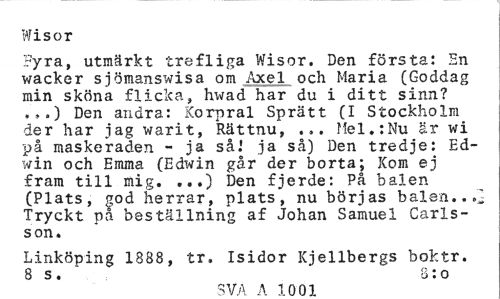 //// Wisor //// Pyra, utmärkt trefliga Wisor. Den första: Sn wacker sjömanswisa om Axel och Maria (Goddag min sköna flicka, hwad har du i ditt sinn? .,.) Den andra: Korpral Sprätt (I Stockholm der har jag warit, Rättnu, ... Mel.:Nu är wi på maskeraden - ja så.' ja så) Den tredje: Edwin och Emma (Edwin går der borta; Kom ej fram till mig. ...) Den fjerde: På balen (Plats, god herrar, plats, nu börjas balen...! Tryckt på beställning af Johan Samuel Carlsson. //// Linköping 1888, tr, Isidor Kjellbergs boktr. //// 8 s. 8:0 //// "Va A mm ////