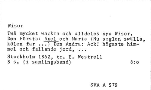 //// Wisor //// Twå mycket wackra och alldeles nya Wisor. Den Första: Axel och Maria (Nu seglen swälla, kölen far ...) Den Andra: AckJ högaste himmel och fallande jord, ... //// Stockholm 1862, tr. E. Westrell 8 s, (i samlingsband) 8:0 //// SVA A 5 79 ////