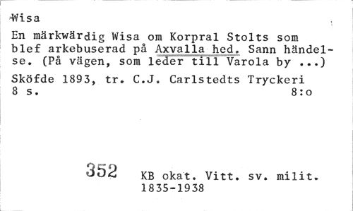 //// •W i s a //// En märkwärdig Wisa om Korpral Stolts som blef arkebuserad på Axvalla hed. Sann händelse. (På vägen, som leder till Varola by ...) //// Sköfde 1893, tr. C.J. Carlstedts Tryckeri 8 s. 8:0 //// 352 KB okat. Vitt. sv. milit. //// 1835-1938 ////