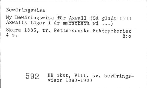 //// Bewäringswisa //// Ny Bewäringswisa för Axwall (Så gladt till Axwalls läger i år marschera wi „.») //// Skara 1883, tr» Pettersonska Boktryckeriet 4 s. 8:0 //// I //// t^QO KB okat, Vitt. sv. bevärings» //// visor 1880-1939 ////