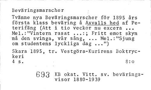 //// Beväringsmarscher //// Tvänne nya Beväringsmarscher för 1895 års första klass beväring å Axvalls hed af Pe-terifäng (Att i tio veckor nu excera ... Mel.:"Vintern rasat Fritt emot skyn //// må den svinga, vår sång, ... Mel.:"Sjung om studentens lyckliga dag ...") //// Skara 1895, tr. Vestgöra-Kurirens Boktryckeri //// 4 s. 8: o //// 7QQ KB okat. Vitt. sv. bevärings- //// ' visor 1880-1939 ////