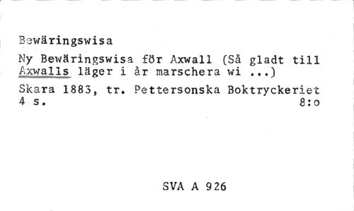 //// Bswäringswisa //// Ny Bewäringswisa för Axwall (Så gladt till Axwalls läger i år marschera wi ...) //// Skara 1883, tr. Pettersonska Boktryckeriet 4 s. 8:0 //// SVA A 9 26 ////