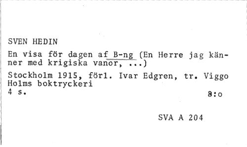 //// SVEN HEDIN //// En visa för dagen af B-ng (En Herre jag känner med krigiska vanor, ...) //// Stockholm 1915, förl. Ivar Edgren, tr. Viggo Holms boktryckeri //// 4 s. 8:0 //// SVA A 204 ////