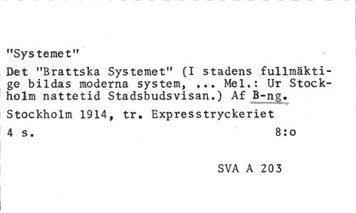 //// "Systemet" //// Det "Brattska Systemet" (I stadens fullmäktige bildas moderna system, ... Mel.: Ur Stockholm nattetid Stadsbudsvisan.) Af B-ng. //// Stockholm 1914, tr. Expresstryckeriet //// 4 s. 8:0 //// SVA A 203 ////