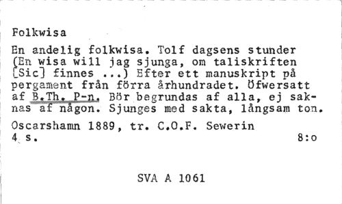 //// Folkwisa //// En andelig folkwisa. Tolf dagsens stunder (En wisa will jag sjunga, om taliskriften [Sicl finnes ...) Efter ett manuskript på pergament från förra århundradet, öfwersatt af B.Th. P-n. 3ör begrundas af alla, ej saknas af någon. Sjunges med sakta, långsam ton. //// Oscarshamn 1889, tr. C.O.F. Sewerin 4 s. 8:0 //// SVA A 10 61 ////