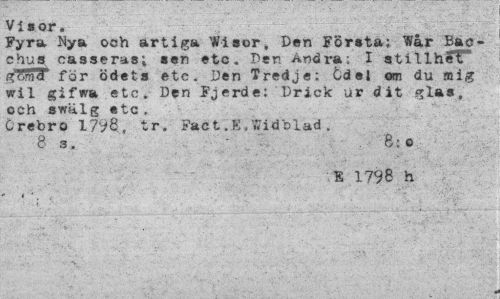 //// Vi«or. //// Fyra Nya och artiga Wiaor, Den Första; Wår Bac-c hus casseras; sen etc. Der. Andra; I stillhet"* för ödets etc. Den Tredje: Cdel om du mig wil gifwa eto. Den Fjerde: Drick ur dit glas, och svalg «tc. //// Crebro 1798, tr. Fact.K/ffidblad. //// 83. B:o //// E 1798 h //// i ' , r . ////