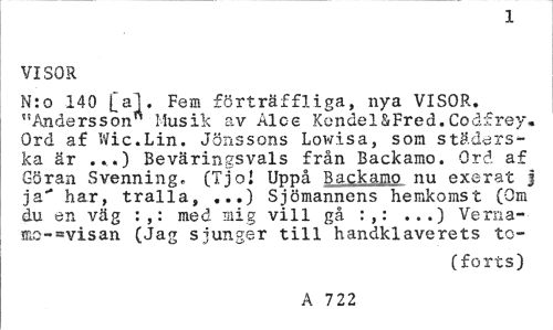 //// 1 //// VISOR //// N:o 140 [al. Fem förträffliga, nya VISOR. "Andersson" llusik av Aloe KondeläFred.Codfrey. Ord af Wic.Lin. Jönssons Lowisa, som städerska är ...) Beväringsvals från Backamo. Ord af Göran Svenning. (Ijol Uppå Backamo nu exerat j ja" har, tralla, ...) Sjömannens hemkomst (Om du en väg :,: med mig vill gå :,: ...) Verna-mc-=visan (Jag sjunger till handklaverets to- //// (forts) //// A 7 22 ////