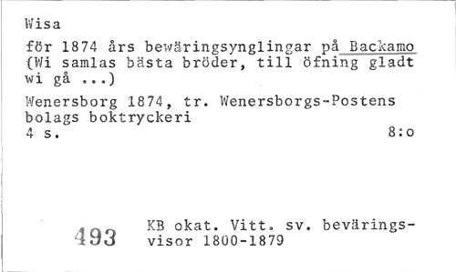 //// Wisa //// för 18 74 års bewäringsynglingår på Backamo (V/i samlas bästa bröder, till öfning gladt wi gå ...) //// Wenersborg 1874, tr. Wenersborgs-Postens bolags boktryckeri //// 4 s. 8:o //// KB okat. Vitt. sv. bevärings- //// J visor 1800-1879 ////