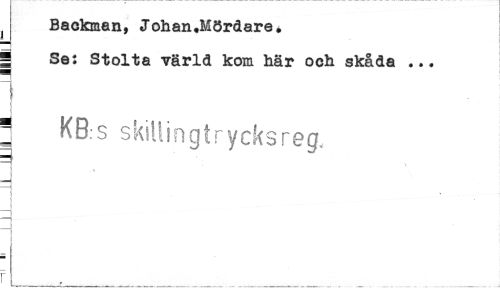 //// Backman, Johan.Mördare. //// | Se: Stolta värld kom här och skåda ... //// 1 //// i //// 1 KB.s skiUingtrycksreg. //// i . //// t //// =j //// f j ___.___ ___ ////