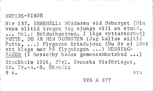 //// NUTIDS-VISOR //// N:r 137. INNEHÅLL: Mördaren vid Uvberget (Min vana alltid trogen jag sjunga vill en stund, ... Mel.: Soldathustrun. I låga ryttartorrset) PUTTE, DU ÄR MIN ÖGONSTEN (Jag kallas alltid Putte, .,.) Flygaren Brindejonc (Nu är ej lönt att klaga mer På flygningen »..) MESSING-BADEM (I Hesselby badas gemensarahetsbad ...) //// Stockholm 1916, föri. Svenska Visförlaget, //// tr, Tr.-A.-B. Skandia //// 8 s. 8:o //// SVA A 8 77 ////