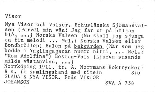 //// Visor //// Nya Visor och Valser. Bohuslänska Sjömansvalsen (Farväl min vänl Jag far ut på böljan blå, ...) Norska Valsen (Nu skall jag sjunga en fin melodi ... Mel.: Norska Valsen eller Bondbröllop) Balen på bakgården (När som jag bodde i Ynglingagatan numro nitti, ... Mel.: "Kom Adolfina") Boston-Vals (Ljufva susande milda västanvind, ...) //// Norrköping 1911, tr. A. Norrmans Boktryckeri 8 s. (i samlingsband med titeln 8:0 //// GLADA & NYA VISOR. Från VIKTOR JOHANSON SVA A 733 ////