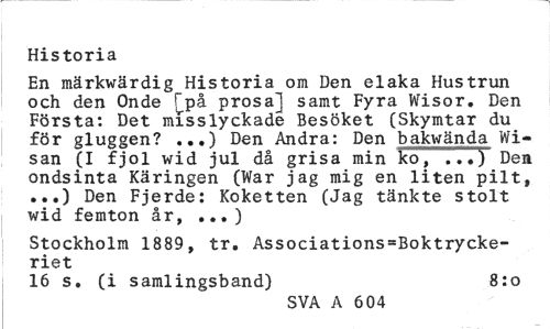 //// Historia //// En märkwärdig Historia om Den elaka Hustrun och den Onde Fpå prosa] samt Fyra Wisor. Den Första: Det misslyckade Besöket (Skymtar du för gluggen? ...) Den Andra: Den bakwända Wi-san (I fjol wid jul då grisa min ko,™...) Den ondsinta Käringen (War jag mig en liten pilt, ...) Den Fjerde: Koketten (Jag tänkte stolt wid femton år, ...) //// Stockholm 1889, tr. Associations=Boktrycke-riet //// 16 s. (i samlingsband) 8:0 //// SVA A 604 ////