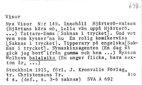 //// Visor //// Nya Visor N:r 149. Innehåll Hjärterö-valsen (Hjärtans kära mö, lella vän uppå Hjärterö. ...) Tattare-Emma fSaknas i trycketJ. Gud vet vem som kysser^na hu En rolig komikervisa (^Saknas i trycket], Tipperary på engelska[Sak-nas i trycket]. Symaskinsagenten (En dag så gick jag bort ifrån gumma och hem ...) Ryssen Wolkovs balalaika (En unger flicka, bara sexton år, 7773 //// Stockholm 1915, förl. J. Kronvalls Förlag, tr. Christensons Tr. 8:0 //// 4 s. (def., s. 3-6 saknas) SVA A 692 ////