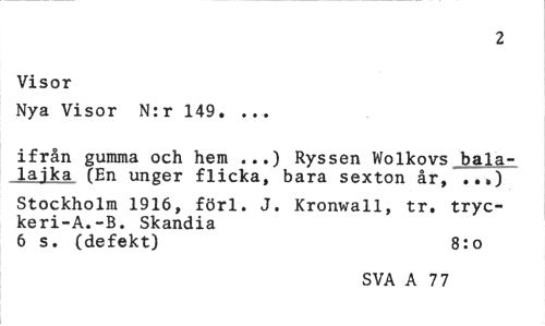 //// 2 //// Visor //// Nya Visor N:r 149. ... //// ifrån gumma och hem ...) Ryssen Wolkovs bala-lajka f£n unger flicka, bara sexton år, ..») //// Stockholm 1916, förl. J. Kronwall, tr. tryckeri-A.-B. Skandia //// 6 s. (defekt) 8:o //// SVA A 77 ////