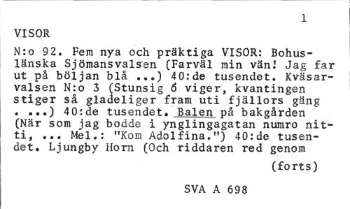 //// 1 //// VISOR //// N:o 92. Fem nya och präktiga VISOR: Bohuslänska Sjömansvalsen (Farväl min vän! Jag far ut på böljan blå ...) 40:de tusendet. Kväsar-valsen N:o 3 (Stunsig 6 viger, kvantingen stiger så gladeliger fram uti fjällors gäng . ...) 40:de tusendet. Balen på bakgården (När som jag bodde i ynglingagatan numro nit-ti, ... Mel.: "Kom Adolfina.") 40:de tusendet. Ljungby Horn (Och riddaren red genom //// (forts) //// SVA A 698 ////