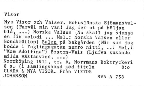 //// Visor //// Nya Visor och Valser» Bohuslänska Sjömansvalsen (Farväl min vän I Jag far ut på böljan blå, ...) Norska Valsen (Nu skall jag sjunga en fin melodi ... Mel.: Norska Valsen eller Bondbröllop) Balen på bakgården (När som jag bodde i Ynglingagatan numro nitti, ..» Mel.: "Kom Adolfina") Boston-Vals (Ljufva susande milda västanvind, ...) //// Norrköping 1911, tr. A. Norrmans Boktryckeri 8 s. (i samlingsband med titeln 8:0 //// GLADA & NYA VISOR. Från VIKTOR JOHANSON SVA A 738 ////