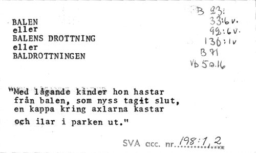//// B a^i //// BALEN 3 3'^' //// eller //// BALENS DROTTNING j ^K . , v //// eller //// BALDROTTNINGEN b n //// wMéd lågande kinder hon hastar från balen, som nyss tagit slut, en kappa kring axlarna kastar //// och ilar i parken ut." //// SVA ccc. nrJ.WJ.iS^ ////