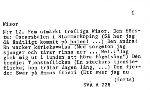 //// 1 //// Wisor //// N:r 12. Fem utmärkt trefliga Wisor. Den första: Oscarsbalen i Slammerköping (Så har jag då ändtligt kommit på balen.' ...) Den andra: En wacker kärleks=wisa (Med sorgéton jag sjunger och tårar rinna ner ... Mel.:"Jag gick mig ut i lunden att höra fågelsång") Den tredje: Tjens teflickan (En stackars tjens te-flicka, hon trälar dagen lång, .*.) Den fjerde: Swar på Emmas frieri (Ett swar jag nu //// (forts) //// SVA A 228 ////