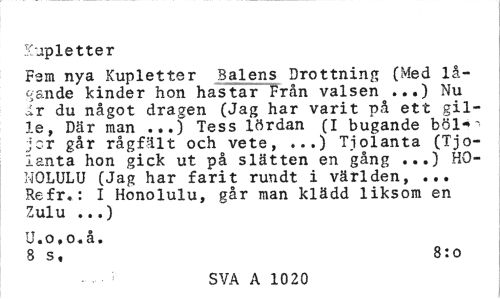 //// Kupletter //// Fem nya Kupletter Balens Drottning (Med lådande kinder hon hastar Från valsen ...) Nu är du något dragen (Jag har varit på ett gille, Där man ...) Tess lördan (I bugande böl-> jer går rågfält och vete, ?..) Tiolanta (Tjo-lanta hon gick ut på slätten en gång ...) H0-NOLULU (Jag har farit rundt i världen, ... Refr.: I Honolulu, går man klädd liksom en Zulu ...) //// U.o.o.å. //// 8 s, 8:0 //// SVA A 1020 ////