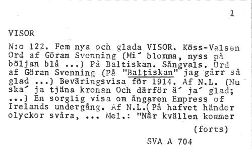 //// 1 //// VISOR //// N:o 122. Fem nya och glada VISOR. Köss-Valsen Ord af Göran Svenning (Mi" blomma, nyss på böljan blå ...) På Baltiskan. Sångvals, Ord af Göran Svenning (På "Baltiskan" jag gårr så glad ...) Beväringsvisa för 1914. Af N.L. (Nu ska' ja tjäna kronan Och därför ä' ja' glad; ...) En sorglig visa om ångaren Empress of Irelands undergång» Af N.L.^På hafvet händer olyckor svåra, ... Mel.: "När kvällen kommer //// (forts) //// SVA A 704 ////