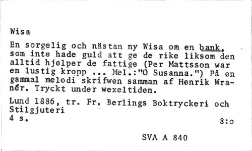 //// Wisa //// En sorgeli g och nästan ny Wisa om en som inte hade guld att ge de rike liksom den alltid hjelper de fattige (Per Mattsson war en lustig kropp ... Mel. :"0 Susanna.»') På en gammal melodi skrifwen samman af Henrik Wra-nér. Tryckt under wexeltiden. //// Lund 1886, tr. Fr. Berlings Boktryckeri och Stilgjuteri //// 4 s. 8:0 //// SVA A 840 ////