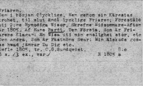 //// 'Haren. - //// i början 01yckl jure , M#r p^tora sin Kärestas rohet, til slut ändÄ lycklige Friaren; Förestäld tJ 2: re Nymodiga Wisor, Skrefrs &id swwnars^Aftor ,r 1805. Af Hans Bard t, D«n Första, So® är Fri-,r«re Klaga'*: Kn Wi sa uti min enslighet stor, etc >én Andrå, 3cwfl är Fästmöns Svar; Min Älskade gos-ie hvad jämrar Du Dia; stc. //// ref le l8o«s tr. C ,G .Sundqwist. 8;o //// t 3. /3 ex., rar,/ £ 180* a ////