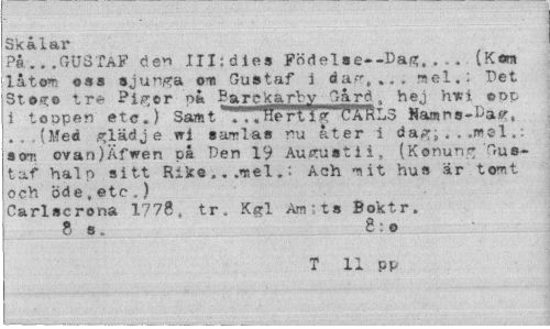 //// Skålar //// På___GUSTAF den III:dies Födelse--Dag. . . (Kom //// låtom oss sjunga on Gustaf i dag,»., mel.: Tet Stog© tre Piger oa Barckarby Gard. hej hvi ©op i toppen etc.) Sam t rfi g CarLS Namns-Da«% //// . . (Med glädje wi samlas nu åter i dag; . . .mel „: sot. ovan)Äfwen på Den 19 Ausrustii, (Konung Gustaf halo sitt Rike...mel.: Ach mit hus är tomt och Öde,etc.) //// Carlserona 1778, tr. Ksrl Ami z a Boktr. 8 s. 8: o //// T 11 pp ////