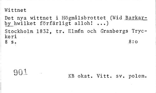 //// Wittnet //// Det nya wittnet i Högmålsbrottet (Wid Barkar-by hwilket förfärligt alloh.' ...) //// Stockholm 1832, tr. Elmén och Granbergs Tryckeri //// 8 s. 8:0 //// q n 1 //// KB okat. Vitt. sv. polem. ////
