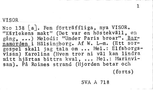 //// 1 //// VISOR //// N:o 138 [a]. Fem förträffliga, nya VISOR. "Kärlekens makt" (Det var en höstekväll, en gång, ...) iMelodi: "Under Paris broar". Barnamorden i Hälsingborg. Af W. L-m. (Ett sorgespel skall jag tala om ... Mel.: Elfsborgs-visan) Karolina (Hvem tror ni väl kan lindra mitt hjärtas bittra kval, ... Mel.: Marinvisan). På Roines strand (Hjorden betar och //// (forts) //// SVA A 718 ////