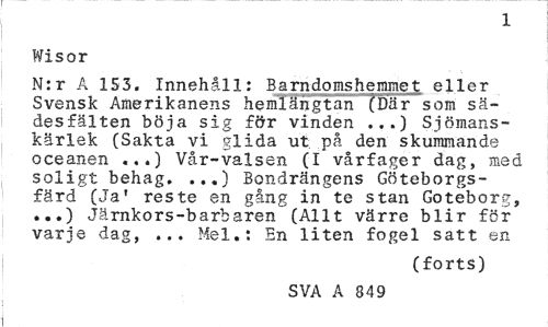 //// 1 //// Wisor //// N:r A 1S3. Innehåll: Barndomshemmet eller Svensk Amerikanens hemlängtan (Där som sädesfälten böja sig för vinden ...) Sjömans-kärlek (Sakta vi glida ut på den skummande oceanen ...) Vår-valsen (I vårfager dag, med soligt behag. ...) Bondrängens Göteborgsfärd (Ja' reste en gång in te stan Goteborg, ...) Järnkors-barbaren (Allt värre blir för varje dag, ... Mel.: En liten fogel satt en //// (forts) //// SVA A 849 ////