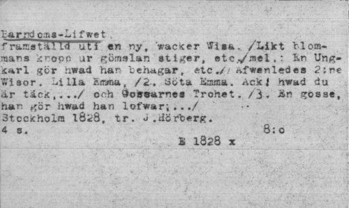 //// Ba r rd c a s - L i f w c t //// fra^sTaTTT*uTT en ny, wacKer tfisa. /Likt blommans knopp ur gömslan stiger, et c../me i .- Kn Ung» tcarl ger hwad han "behagar, etc.// ^fwenledes 2 ; ne wisor. Lilla Emma, /2. Söta Emma. Ack i hwad du är täck,..,/ och ^oisrearnes Trohet. / 3. ÅR gosse, lian gör hwad han lofwar;,../ Stockholm 18*8, tr. J.dcrberg. 4 s. 8;o //// S 1828 x ////