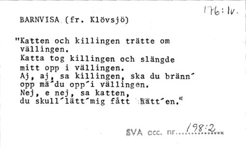 //// 1%' Ii/- //// BARNVISA (fr. Klövsjö) //// "Katten och killingen trätte om vällingen. //// Katta tog killingen och slängde //// mitt opp i vällingen. //// Aj , aj , sa killingen, ska du bränn' //// opp mä'du opp'i vällingen. //// Nej, e nej, sa katten, //// du skull'lätt'mig fått hått'en.,: //// SVA ccc. nr ////