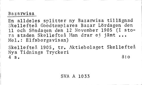 //// Bazarwisa //// En alldeles splitter ny Bazarwisa tillägnad Skellefteå Goodtemplares Bazar Lördagen den 11 och Söndagen den 12 November 1905 (I stora staden Skellefteå Man drar ei jämt ... Mel.: Elfsborgsvisan) //// Skellefteå 1905, tr. Aktiebolaget Skellefteå Nya Tidnings Tryckeri //// 4 s. B:o //// SVA A 10 33 ////