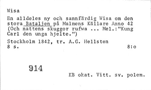 //// Wisa //// En alldeles ny och sannfärdig Wisa om den stora Bataljen på Malmens Källare Anno 42 (Och nattens skuggor rufwa ... Mel.:"Kung Carl den unga hjelte.") //// Stockholm 1842, tr. A.G. Hellsten 8 s. 8: o //// 914 //// KB okat. Vitt. sv. polem. ////