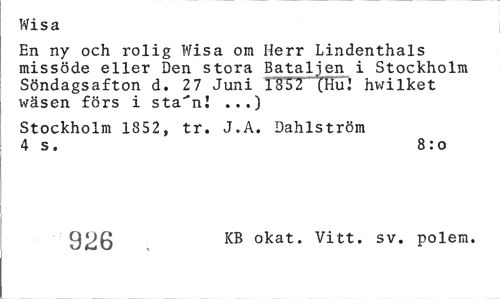 //// Wisa //// En ny och rolig Wisa om Herr Lindenthals missöde eller Den stora Bataljen i Stockholm Söndags afton d. 2 7 Juni 1"852 (Hu"J hwilket wäsen förs i sta"*n! ...) //// Stockholm 1852, tr. J.A. Dahlström 4 s. 8:o //// 926 KB okat* Vitt. sv. polem. ////