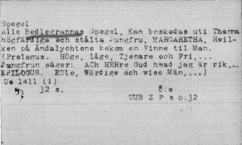 //// Spegel //// Alle Bed^ejTramji^i Spegel, Kan beskodas uti Thenna högfaPSliga"oc^ stålta Jungfru„ MARGARETHA, Hwil-ken på Ändalychtone bekom en ^inne til Man, (Proiogus, Höge, låge, Tjenare och Pri,... Fmngfrun säger; ACh HERre Gud hwad jag är rik,», SPILOGtlS» EDle, Word ige och wise Män,.,.) U» 1411 { 1 i //// 3 2 3. 8 - 0 //// " r UUB 2 P s 6;32 ////