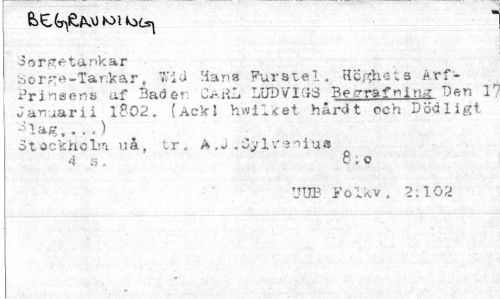 //// 3orf?etankar //// Sor-^-Tankar, 7,'ij Hans Furste 1. Hö/*het s Arf- //// Prinaens af Badet C^tfL LUDVIGS Begrafnln^ Den 1' Januari i 1-802. (Ack I hwil<cet hårdt och Dödligt •Hag, . . . ) //// Stockholm uå, tr. A . j . C>j lvrnius //// 4 s . 8 ; o //// UUP- Pol k V . 2:10?. ////
