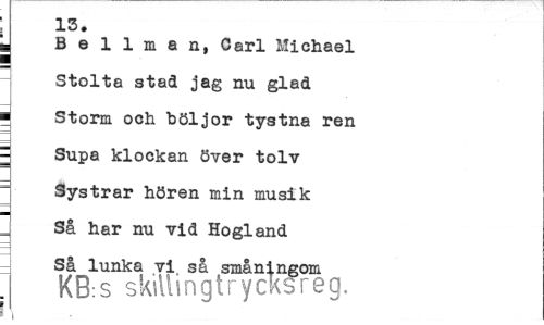 //// 13. //// s B e 1 1 m a n, Carl Michael //// I //// - Stolta stad jag nu glad ¦ Storm och böljor tystna ren | Supa klockan över tolv Systrar hören min musik Så har nu vid Högland Så lunka vi så småningom //// KB:s skiUingtrycKsreg. //// l i ////