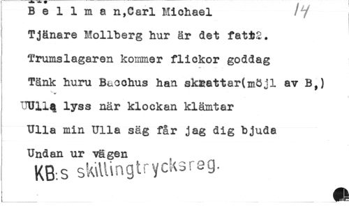 //// B e 1 1 m a n,Carl Michael /7 //// Tjänare Mollberg hur är det fati2. Trumslagaren kommer flickor goddag Tänk huru Bacchus han skcattar(möjl av B,) TJU11% lyss när klockan klämtar TJlla min Ulla säg får jag dig bjuda //// Undan ur vägen //// KB.S skWUngtrycksrag. //// ___ ___ ////