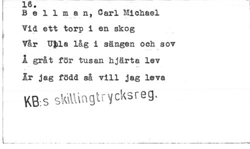 //// B e 1 1 m a n, Carl Michael Vid ett torp i en skog Vår TJ|)la låg i sängen och sov Å. gråt för tusan hjärta lev Ir jag född så vill jag leva //// KB:S stattingtrycksreg. ////