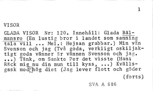 //// 1 //// VISOR //// GLADA VISOR Nr: 120. Innehåll: Glada Bäl-mansro (En lustig bror i landet som sanning tala vill ... Mel.: Hejsan grabbar.) Min vän Svenson och jag (Två goda, verkligt oskiljaktigt goda vänner är vännen Svenson och jag. ...) Tänk, om Sankte Per det visste (Han; Räck mig nu din mun till kyss, ...) Kvälls-gask mod[!]hög diet (Jag lever flott och göder //// (forts) //// SVA A 6 86 ////