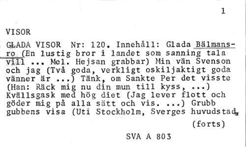 //// 1 //// VISOR //// GLADA VISOR Nr: 120. Innehåll: Glada Bälmans-ro (En lustig bror i landet som sanning tala vill ... Mel. Hejsan grabbar) Min vän Svenson och jag (Två goda, verkligt oskiljaktigt goda vänner är ...) Tänk, om Sankte Per det visste (Han: Räck mig nu din mun till kyss, ...) Kvälls.gask med hög diet (Jag lever flott och göder mig på alla sätt och vis. ...) Grubb gubbens visa (Uti Stockholm, Sverges huvudstad, //// (forts) //// SVA A 80 3 ////
