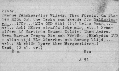 //// Visor. //// Twenne Tänckwärdige Wijsor, Then Första. Cm 3ta-den RIGA Och the Teckn som skedde för Bela^r!mt-#nv ..1709. .. ?MIn GUD Uthi titt helga Tiamn.TTT** mel.; AchJ HKrre straffa icke mig, etc.) Fram~ gifwsn Af Martinus Erasmi Duliin. Then And ra. 3*rea Barms Trogna Bön och Förbön. (Eliskydda GUD i allvn tijd "'ar öfwerhet och Konung blijd,,.. mel»; Så skiön lyser then Mor^onst iern. ). Ueoå (2 ol. tr.) //// 8 s. B-, o //// A 54 ////