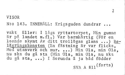 //// 2 //// VISOR //// N:o 143. INNEHÅLL: Krigsguden dundrar ... //// vakt Eller: I låga ryttartorpet, Min gumma är på landet m.fl.) Var barmhärtig (För en leende skymt Av ditt trollögas glans ...) Belägringskonsten (En fästning är var flicka, Med utanverk och mur. ...) Min Ola, min Ola, nu ska du gå sta (Min Ola, min Ola, nu ska du gå sta, ...) I Sorunda ä ja båd födder //// SVA A 811Cf0rtS) ////