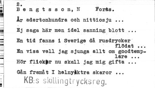 //// t z, //// Bengtsson, N ForÉs. //// År adertonhundra och nittiosju ... //// i Ej saga här men idel sanning blott ... //// : En tid fanns i Sverige då rusdrycker | flödat ... //// En visa vell jag sjunga allt om goodtemp-5 lare ... //// Hör flickar nu skall jag mig gifta ... //// Gån framåt I helnyfcktra skaror ... //// I KB s skillingtrycksreg. ////