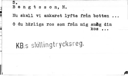 //// • //// B e n g t s s o n, N. //// i //// ! Nu skall vi ankaret lyfta från botten ... //// 0 du härliga ros som från mig smÄg din ^ kos ,.. //// KB.s skillingtrycksreg. ////