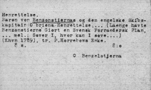 //// Henrettelse. //// Baren vor Bena afla t i er na e og den engelske 3ki*bs-kapitair C^riens Henréttelse ,... {Laenge hävte Benzonatierne" Giort en Svensk Forraedersk Plan, ... reol.: Sover I, hvor kan I sove...) (Khvn 1789), tr. P.Horrebews Enke. //// 8 s. 8:o //// 0 Benzflsjtierria ////
