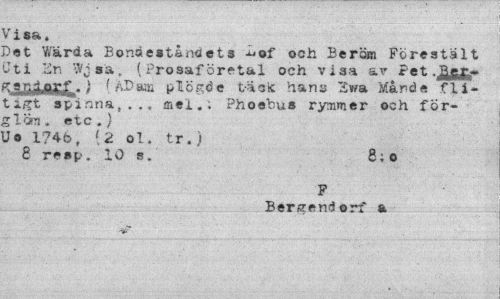 //// Visa. //// Det Wärda Bondeståndets -"Of och Beröm Förestalt 'Jti Jln vVj sa. (Prosaföretal och visa ar Pet .Jöftfe» gftffijfaWjT- s plöjde t^etc hans 2wa Månde fli- //// tigt spinna,.,, mel.; Phoahus rymmer och för-Slöm. etc.) Uo l?4b, [2 ol. tr. ) //// 8 resp, 10 s. 8;o //// F //// Bergendorf a //// v"" ////