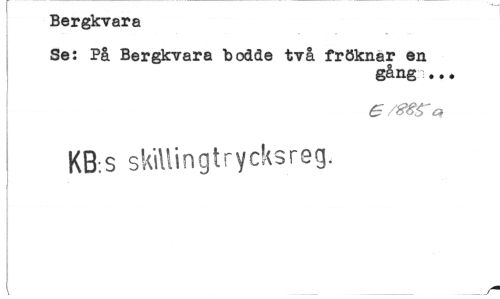 //// Bergkvara //// Se: På Bergkvara bodde två fröknar en //// gång ... //// e /ess' //// KB.s skillingtrycksreg. ////