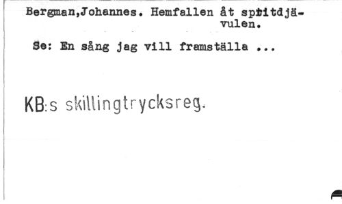 //// Bergman,Johannes. Hemfallen åt spfcitdjä- //// vulen. //// Se: En sång jag vill framställa ... //// KB.s skillingtrycksreg. //// t ////